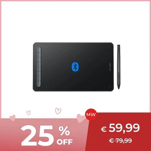 Das Deco MW Stift-Tablett ist mit einem Bluetooth v5.0-Chip ausgestattet und ermöglicht es Ihnen, ohne Kabel zu arbeiten. So können Sie Ihren kreativen Raum organisieren und Ihren XP-PEN überall dort einsetzen, wo Ihre Inspiration Sie hinführt.