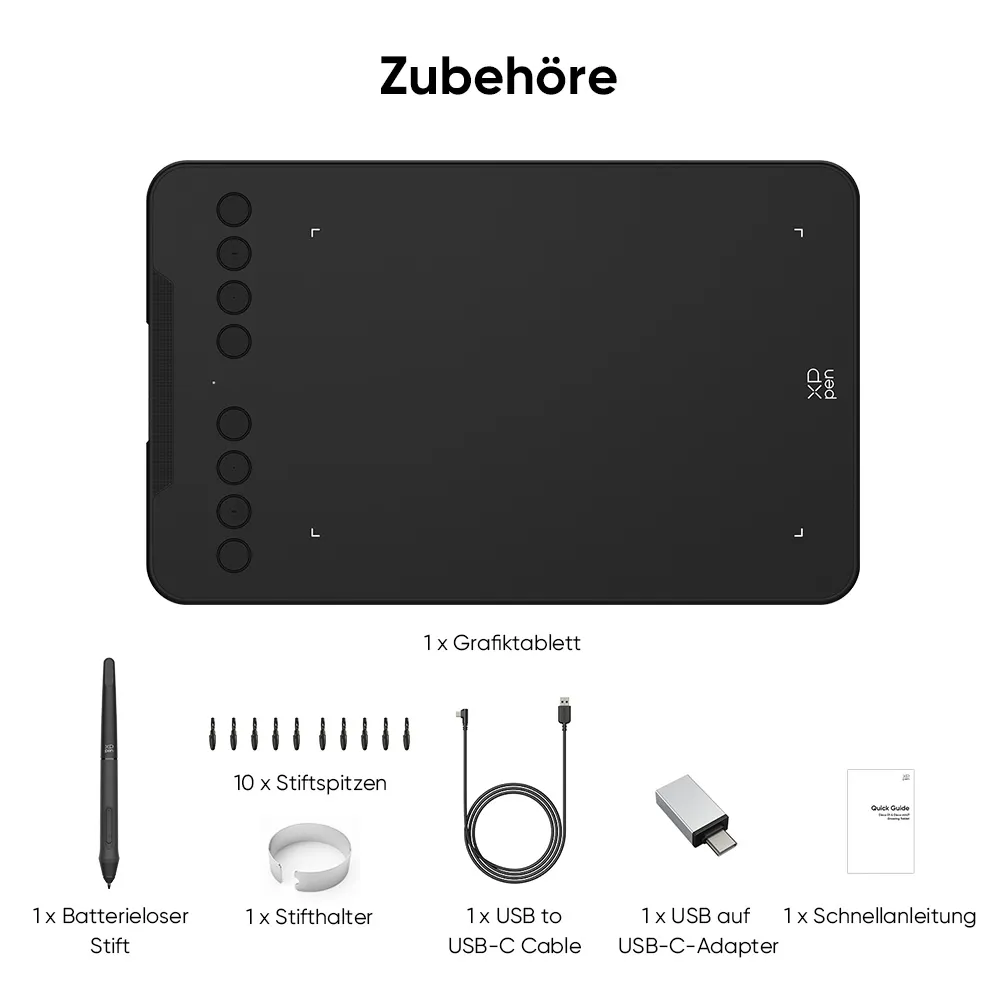 Das Deco mini7 V2 wird mit einem batterielosen passiven Stift P05D geliefert, der stundenlanges Arbeiten ohne Unterbrechung ermöglicht. Der Stift lässt sich außerdem um bis zu 60 Grad neigen, was das Schattieren einfach und effektiv macht.