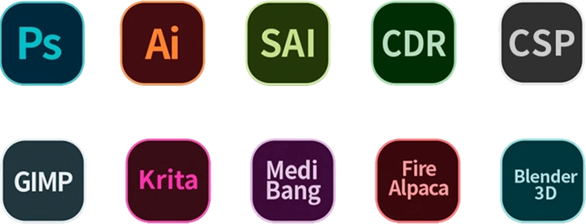 Kompatibel mit beliebten digitalen Kunstprogrammen wie Adobe Photoshop, Illustrator, SAI, CDR, Clip Studio Paint, GIMP, Krita, MediBang, FireAlpaca, Blender3D usw.