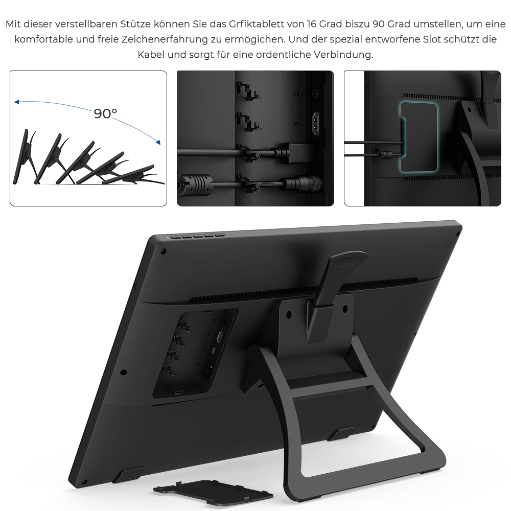 Mit dem verstellbaren Ständer können Sie den Winkel des Bildschirms von 16 bis 90 Grad nach Ihren Bedürfnissen verändern und bequem und frei gestalten. Außerdem sorgen der speziell entworfene Kabelschlitz und die abnehmbare hintere Abdeckung dafür, dass Ihre Kabel geschützt und ordentlich bleiben.